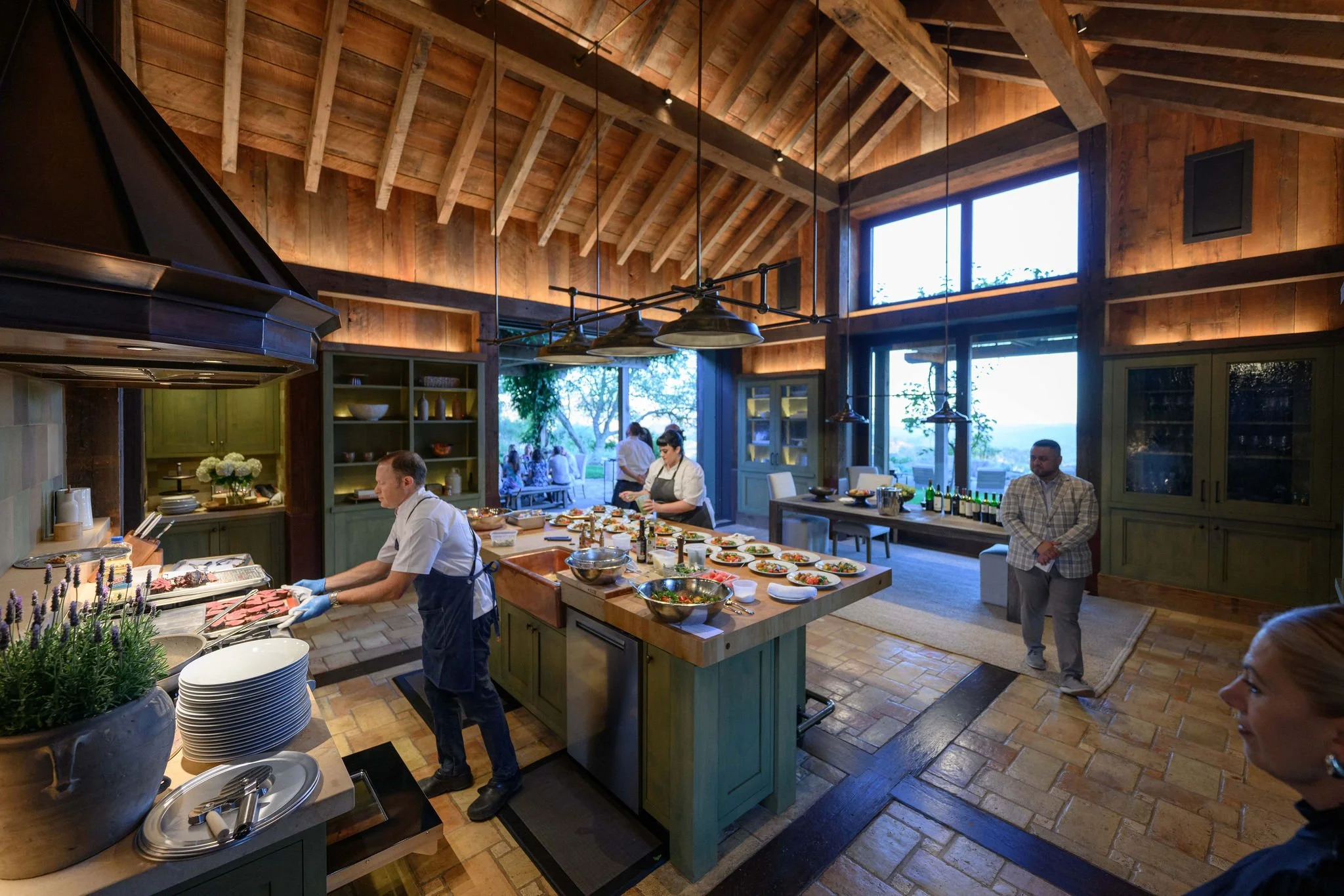 Just down the hall, the large kitchen and adjoining butler’s pantry are fully equipped for any culinary endeavor, complete with Hestan cookware and Thomas Keller signature knives ideal for preparing anything from a relaxed family meal to a chef-curated dinner.
