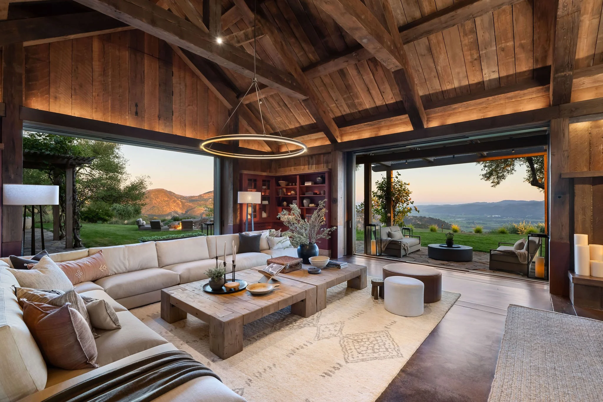At the center of the home is a grand dining room with seating for 14, flanked by two comfortable seating areas, all anchored by a signature oversized fireplace designed by Howard Backen, perfect for cozy evenings and special celebrations. Expansive sliding doors disappear into the walls, seamlessly blending indoor and outdoor living while framing sweeping views of the valley below.